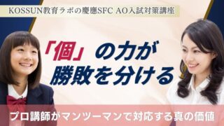 KOSSUN教育ラボは、慶應義塾大学SFC(湘南藤沢キャンパス)の総合型選抜(AO入試)に特化した対策を行っています。受験でお困りの方は、お気軽に無料個別相談会にお申し込みください。