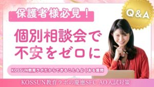 こんにちは!KOSSUN教育ラボ教務担当です。 慶應SFCのAO入試対策を検討される際、多くの保護者様が二の足を踏む最大の要因は「不合格だった際のリスク」です。高額な授業料を支払っても、合格が保証されないのが塾業界の通説 […]